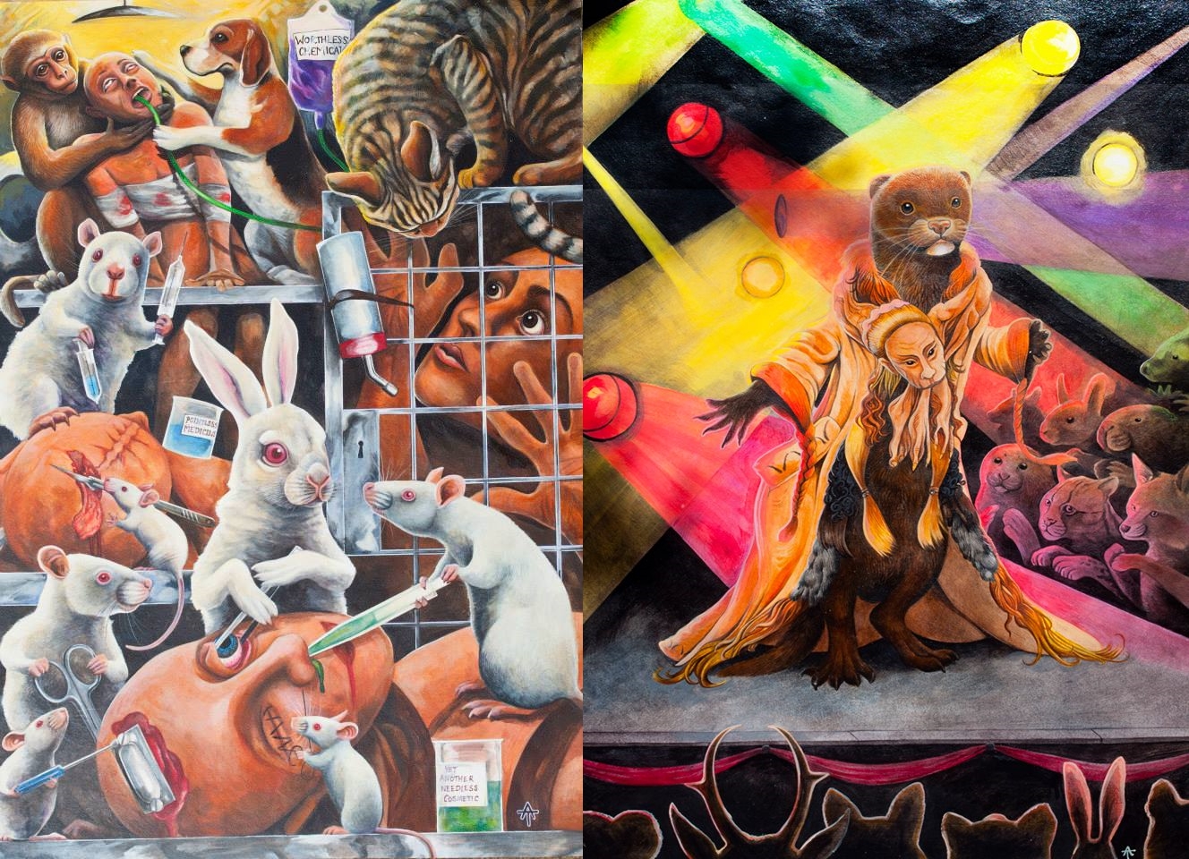 Não há dúvida que a intenção é chocar o público, até porque o artista assume a função de provocar quem não vê os animais como sujeitos de direitos, como se o papel das demais espécies fosse nos servir. O uso das cores dá uma tônica espetaculosa de visceralização de uma realidade reversa.