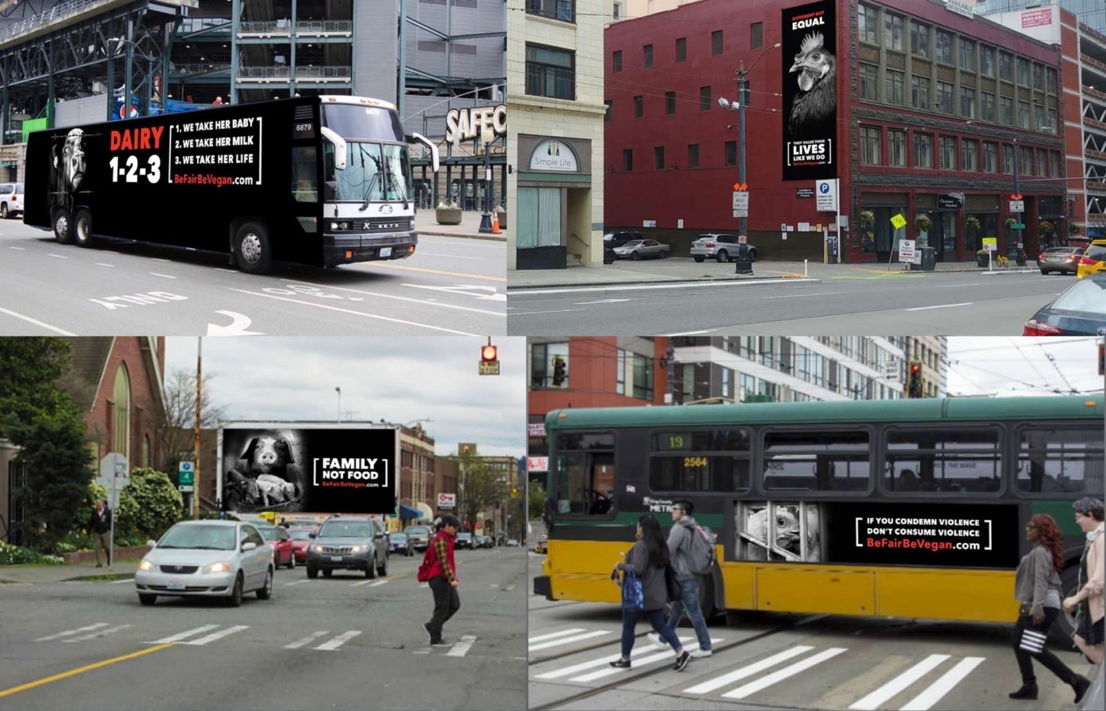 Esta semana, Seattle, nos Estados Unidos, começou a ser bombardeada com uma série de anúncios veganos. A campanha coordenada pela organização australiana Be Fair Be Vegan prossegue até o final de agosto e pode ser vista em ônibus, outdoors e túneis.