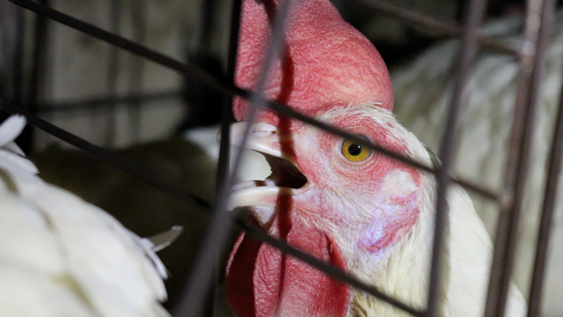 “Dentro de um espaço que não excede 25×25 cm para cada ave, onde há pouca ou nenhuma luz solar, e onde o estresse e a superlotação as tornam vulneráveis a muitas doenças, obrigando os produtores a administrarem grandes quantidades de antibióticos.”