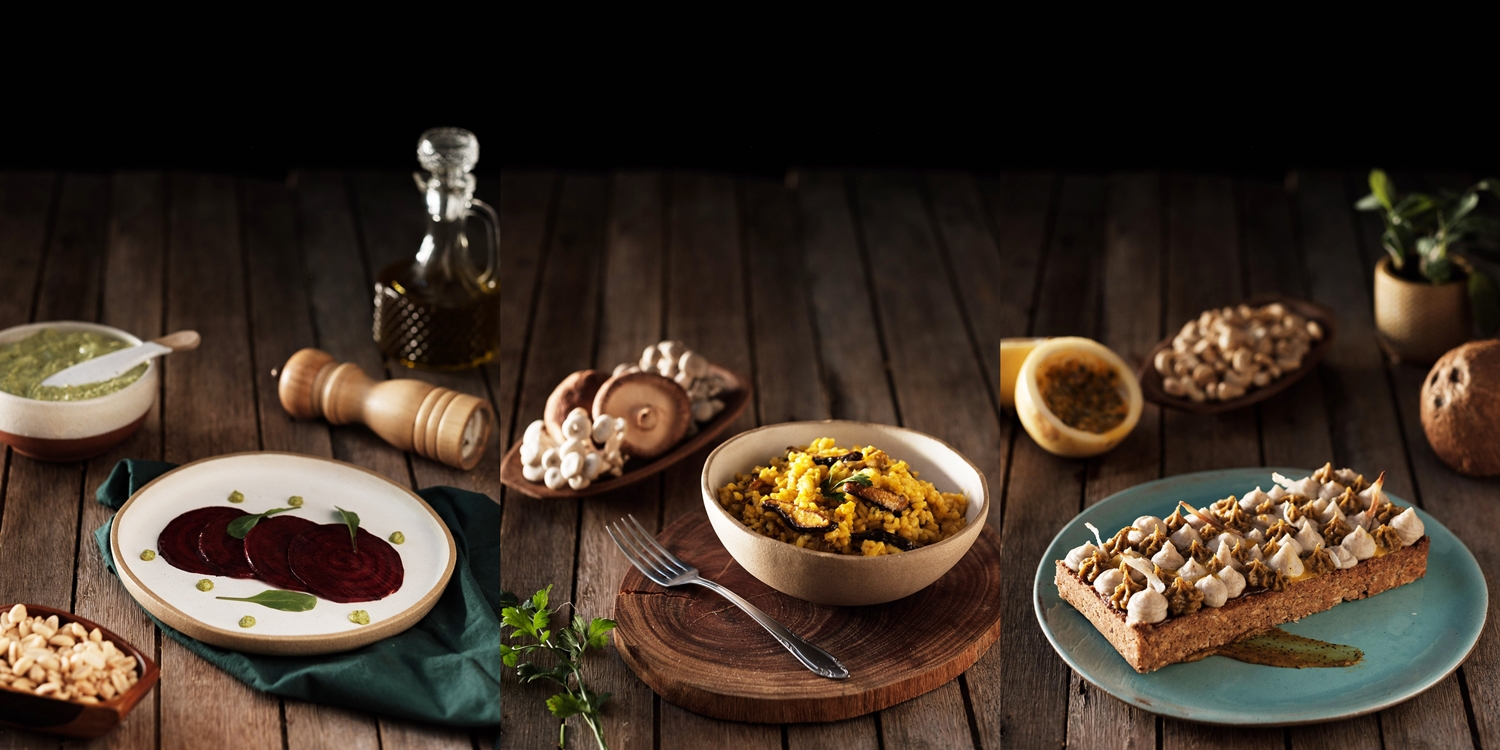 Juntas, elas criaram o menu “Toda forma de amor”, livre de glúten e de ingredientes de origem animal, que oferece entrada, prato principal e sobremesa para uma (R$ 90) ou duas pessoas (R$ 165).