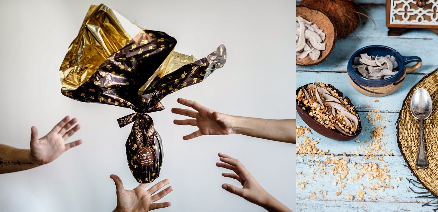 Mas o carro-chefe é o Ovo de Colher, e a Conflor permite que o cliente escolha a casca do ovo – que pode ser de chocolate Callebaut 50% (a partir de R$ 58) ou Premium orgânico com chocolate 60% (a partir de R$ 80), podendo ser com ou sem glúten.