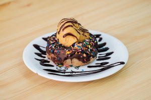 “Há também opções recheadas com ganache de chocolate, geleia de morango ou doce de leite de castanha. É possível também adicionar uma bola de sorvete vegano aos donuts tradicionais ou recheados”, informa Luisa.