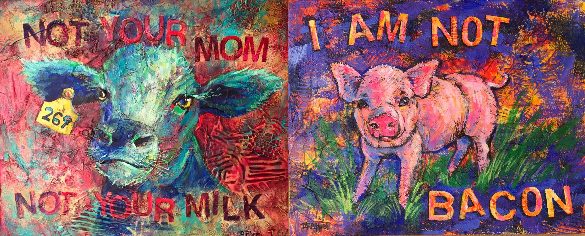 Dina Appel também oferta mensagens simples e diretas – como a rejeição à ideia de que o leite de vaca deve ser consumido por alguém que não seja um bezerro; o antagonismo à associação de um ser sociável como o porco com meros pedaços de bacon – como se suas vidas valessem apenas fragmentos de gorduras subcutâneas extraídas de suas barrigas ou traseiros.