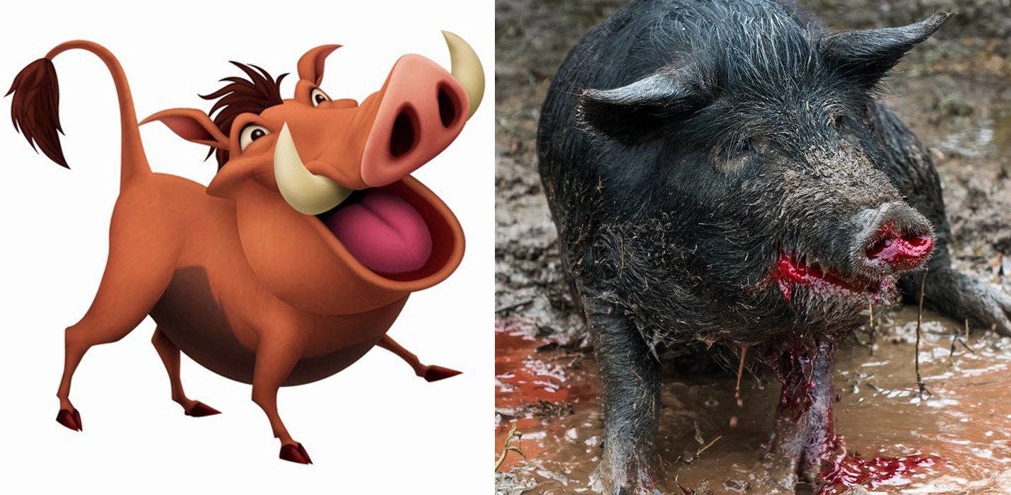Uso o exemplo de Pumba porque ele, sendo um tipo de javali, evoca outro javali (sus-scrofa), da espécie do animal mais caçado no Brasil, e que teve sua caça ainda mais facilitada por meio de uma portaria publicada em 4 de abril de 2019, permitindo também o uso de cães e armas brancas. Portanto uma prática ainda mais cruel. Também não é difícil encontrar fotos desses animais expostos como se matá-los fosse um tipo de diversão.