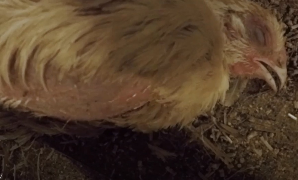 No vídeo, animais aparecem agonizando e morrendo no chão dos aviários. “Eles podem ser vistos com falta de ar, seus corações e pulmões mal conseguindo lidar com a deformação de seus corpos enormes.”