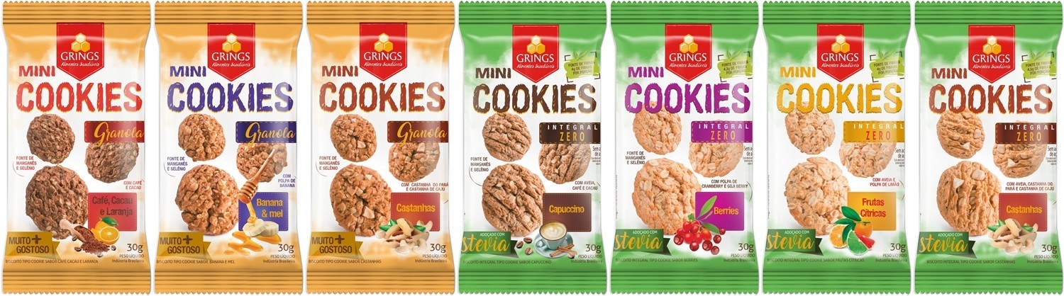 A fabricante de alimentos Grings está comercializando sete sabores de Mini Cookies veganos. Os produtos que vêm em porção de 30 gramas são vendidos nas versões Granola e Integral Zero Açúcar (adoçados com stevia).