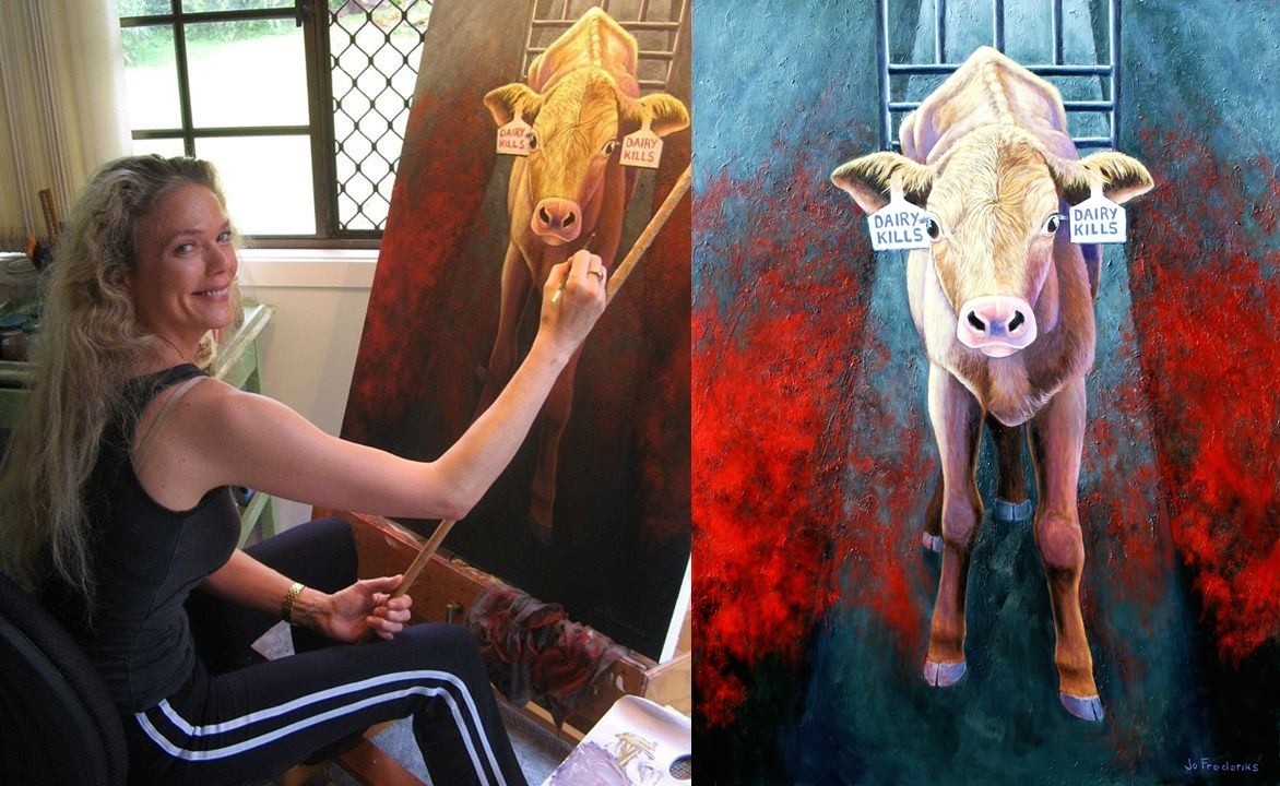 Jo Frederiks é uma artista australiana que cria desenhos e pinturas para conscientizar as pessoas sobre a crueldade contra os animais na indústria alimentícia, farmacêutica e de entretenimento. Durante muitos anos, ela se dedicou principalmente à vida selvagem enquanto tema, até que em 2010, sentindo-se frustrada e desiludida com a sua arte, decidiu buscar uma motivação maior.
