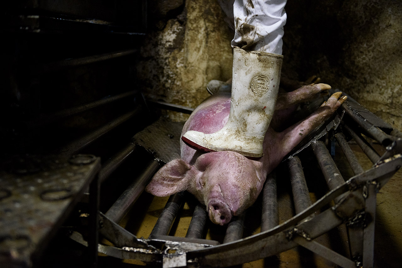 Depois de abater um porco, sentiu algo estranho e teve dificuldade pra andar. Outro funcionário mal arrastava a galocha. Em minutos, não havia mais abatedor de pé. Todos estavam sentados no chão.