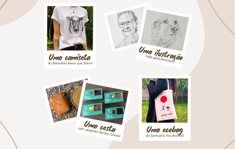 1º Prêmio – Camiseta do Santuário Amor que Salva + ecobag Libertação Animal do Santuário Voz Animal + kit de cosméticos veganos da Alcaleco + desenho personalizado da pessoa com seu bichinho de estimação + cesta de produtos da Somos Green.