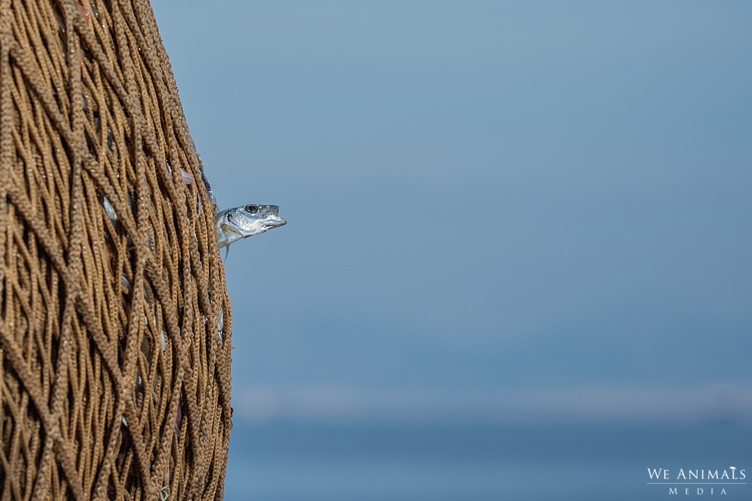 Um peixe tenta escapar da morte por asfixia. É tão pequeno que é o único a conseguir atravessar parte do corpo pela rede de emalhar. Fica entre a prisão e a liberdade. A prisão já é a realidade, e a possibilidade uma luta pela liberdade.